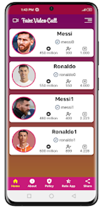 Messi Ronaldo Fake Video Call Prankは、FakevideocallappsがAndroidユーザー向けに開発した無料のライフスタイルアプリです。その名前が示すように、このアプリはユーザーにサッカーのレジェンドであるMessiとRonaldoからの偽のビデオ通話を受け取ることを可能にします。このアプリはエンターテイメント目的で設計されており、友達や家族をだますためのいたずら好きに最適です。